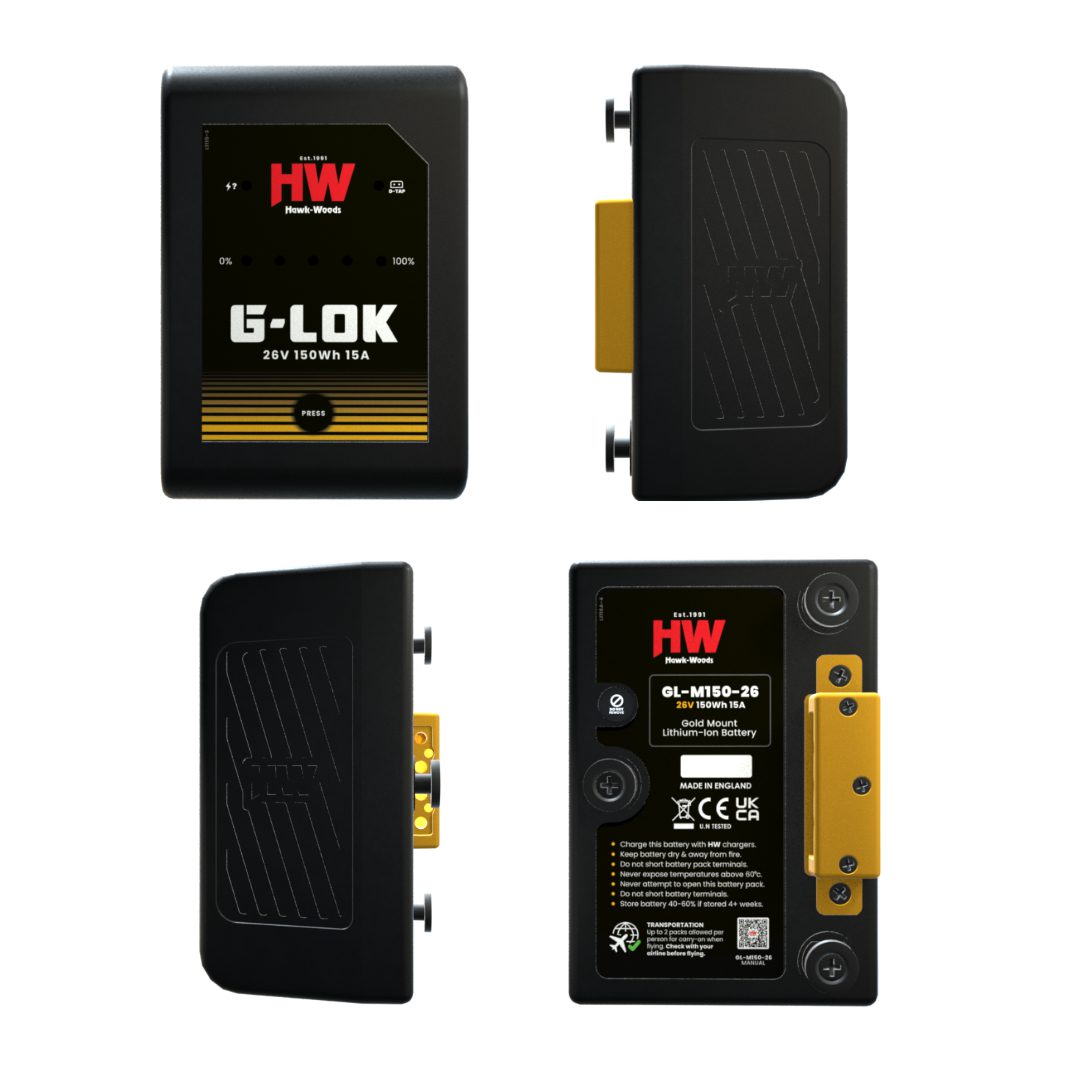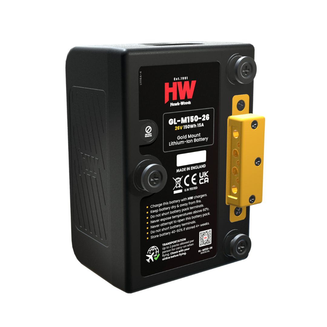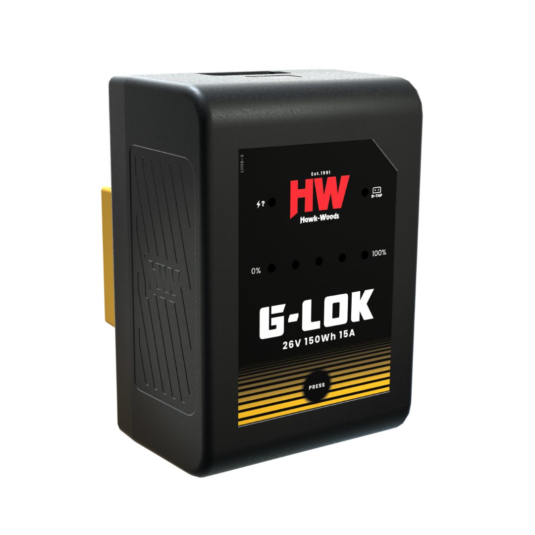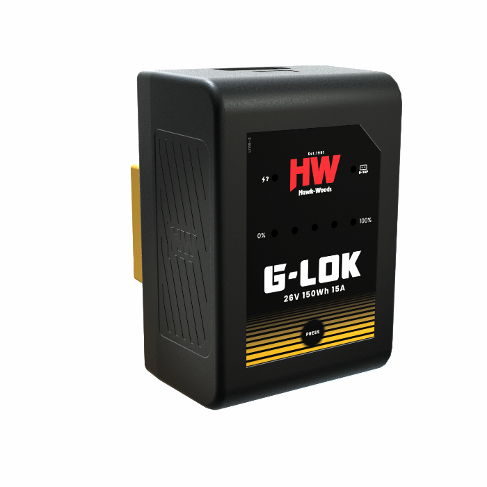 Introducing the Hawk-Woods Mini G-Lok 26v (Gold Mount) battery designed for modern Broadcast & Cine Applications.